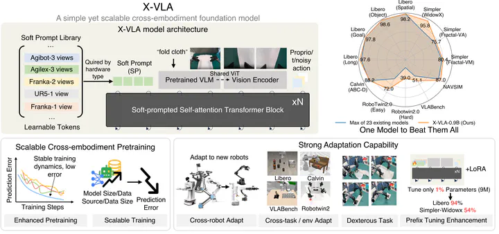 Successful generalist Vision-Language-Action (VLA) models rely on effective training across diverse robotic platforms with large-scale, cross-embodiment, heterogeneous datasets. To facilitate and leverage the heterogeneity in rich, diverse robotic data sources, we propose a novel Soft Prompt approach with minimally added parameters, by infusing prompt learning concepts into cross-embodiment robot learning and introducing separate sets of learnable embeddings for each distinct data source. These embeddings serve as embodiment-specific prompts, which in unity empower VLA models with effective exploitation of varying cross-embodiment features. Our new X-VLA, a neat flow-matching-based VLA architecture, relies exclusively on soft-prompted standard Transformer encoders, enjoying both scalability and simplicity. Evaluated across 6 simulations as well as 3 real-world robots, our 0.9B instantiation-X-VLA-0.9B simultaneously achieves SOTA performance over a sweep of benchmarks, demonstrating superior results on a wide axes of capabilities, from flexible dexterity to quick adaptation across embodiments, environments, and tasks. Website: https://thu-air-dream.github.io/X-VLA/.